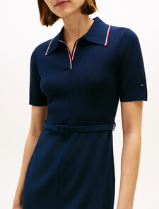 Tailored for Asia silhouettes, this mixed media dress features signature tapes on the collar and placket for a branded touch, while a tonal belt cinches the waist for subtle definition.