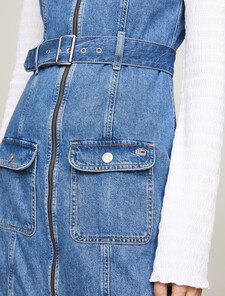 This mini dress puts a feminine twist on denim looks with its sleeveless bodycon style and waist-cinching belt.