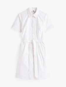 Delicate eyelet embroidery infuses feminine charm into this cotton shirt dress. Finished with a matching tie belt, the flattering silhouette effortlessly transitions from office hours to relaxed off-duty moments.