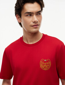 This stretch-cotton crewneck T-shirt features a striking golden logo patch for a bold, fresh statement.