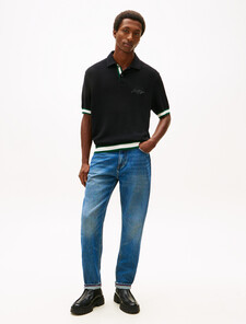 Tommy’s essential polo shirt is reimagined in flat-knit cotton, detailed with two-tone stripes and Tommy Hilfiger embroidery.