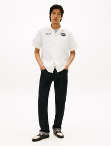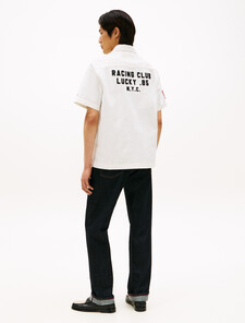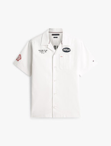 Cut from pure cotton in a timeless herringbone pattern, this relaxed-fit shirt features a camp collar and racing club-inspired patches for an effortlessly laid-back vibe.