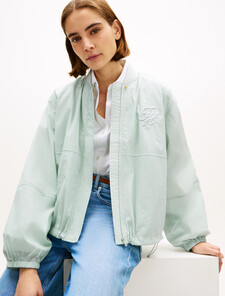 With tactile logo embroidery and balloon-sleeve silhouette, this sporty bomber jacket is a sophisticated statement piece with modern energy.