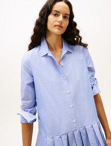 Sparkle your way through party season in this preppy shirt dress that features a pleated skirt and all-over metallic thread detailing.