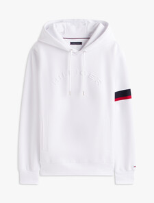 A cotton-rich stretch sweatshirt with a sleek, smooth finish, featuring an embossed chest logo and a bold striped arm insert that adds a distinctly sporty edge.